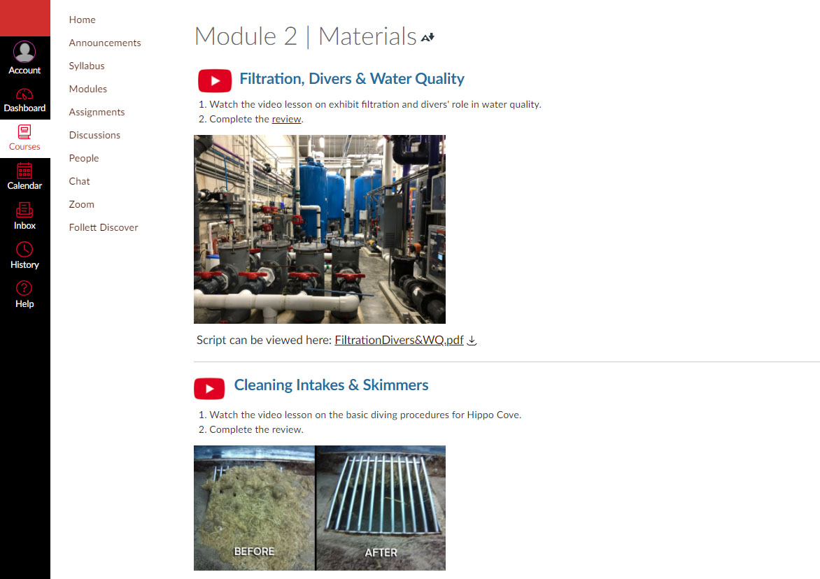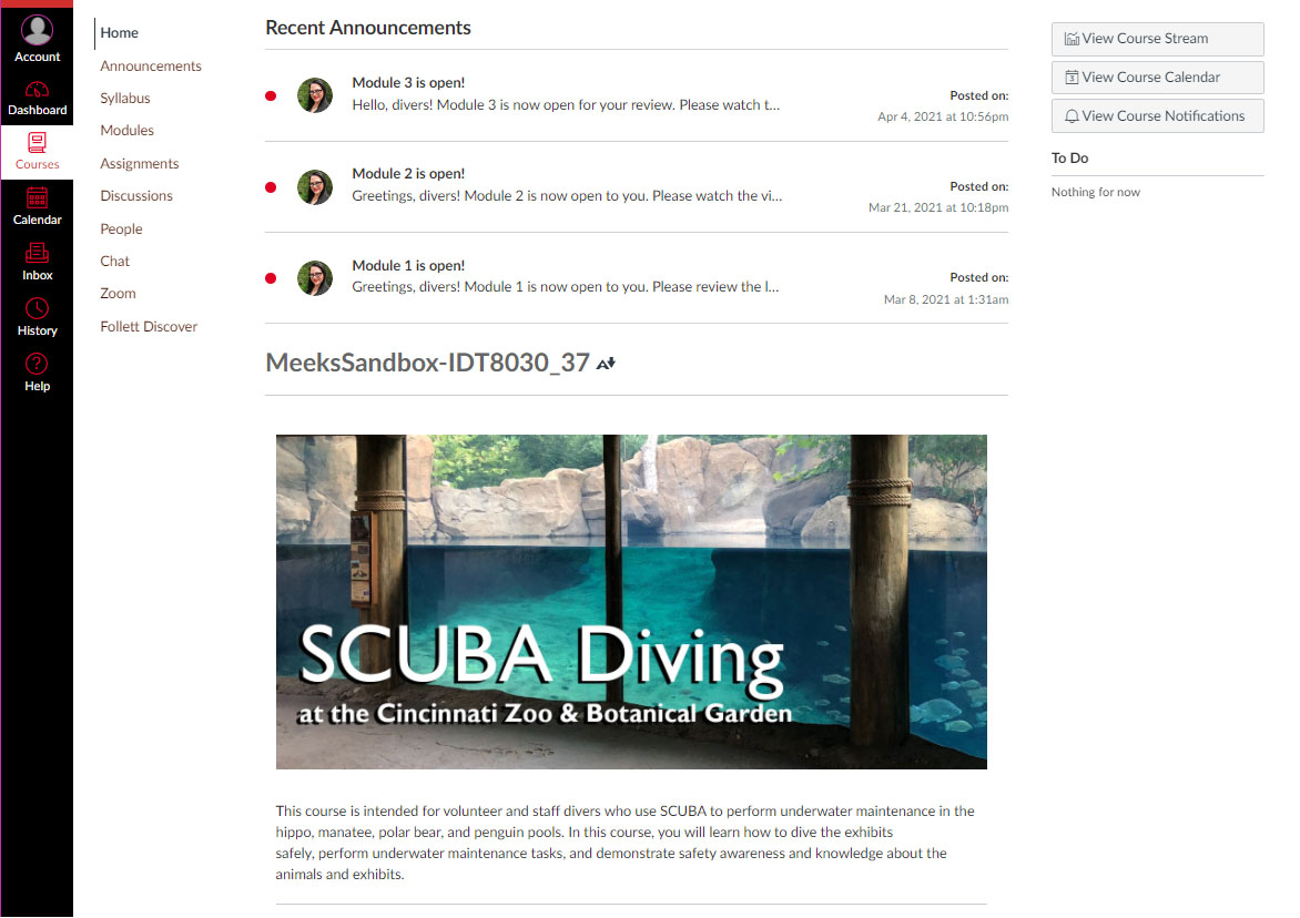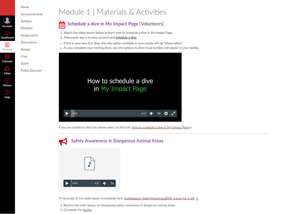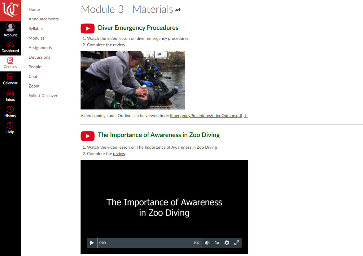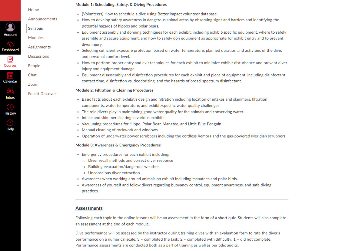 This blended learning program, hosted in Canvas, was designed to train volunteer and staff maintenance divers at the Cincinnati Zoo, using both online lessons and in-person practice. The program content includes video segments created in Premiere Pro, an audio lesson made with Audacity, and assessments.